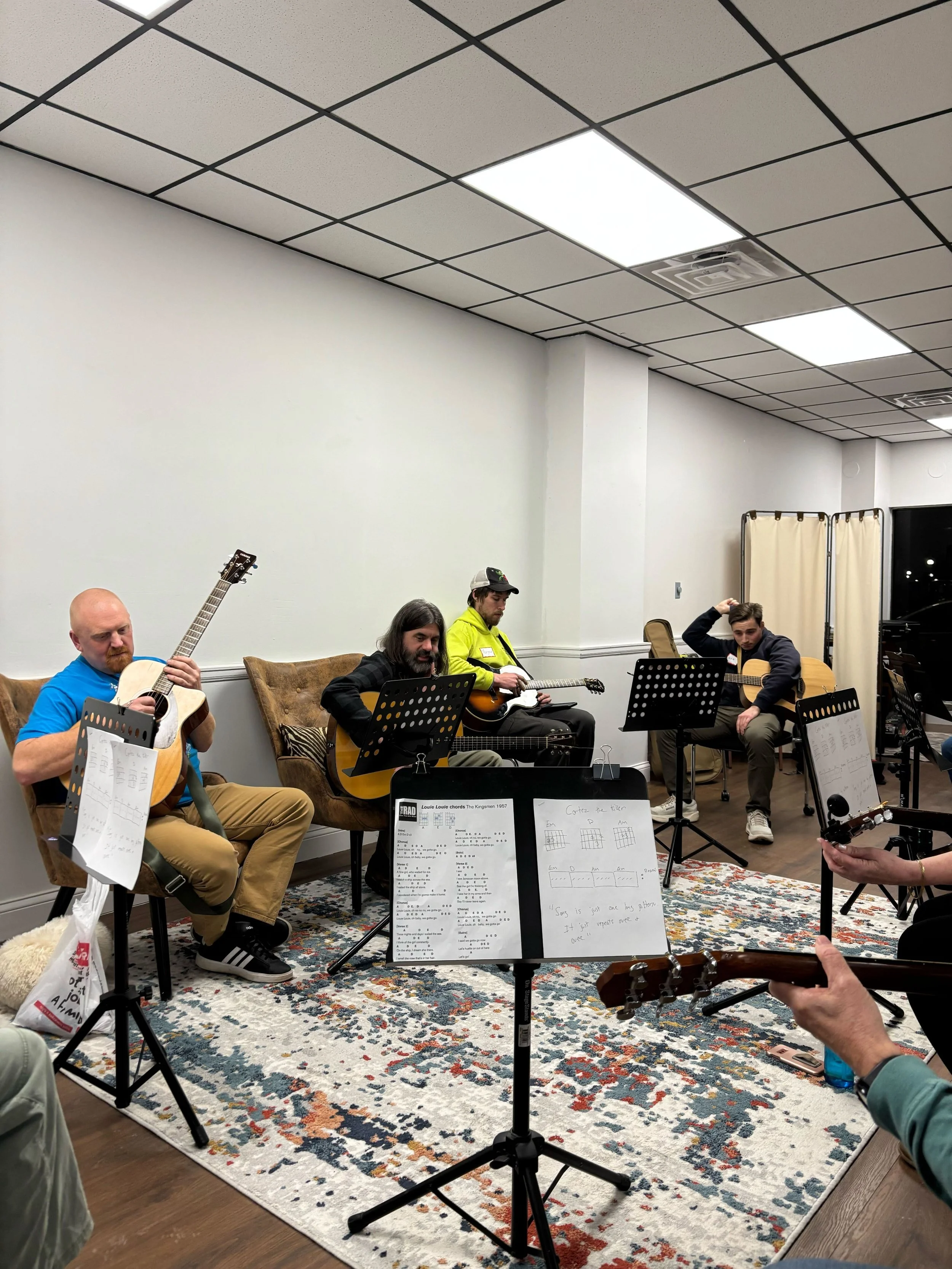 Our Beginner Guitar Course was created for those with little to no experience. Instead of focusing heavily on scales or music theory, this class emphasized learning simple chords and strumming patterns through popular rock and pop songs, both classic and modern favorites. Over six sessions, students built confidence by playing real songs from day one in a fun, supportive group environment.